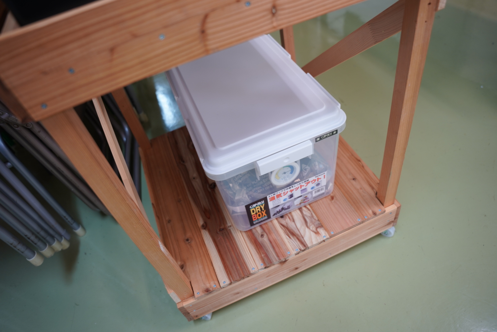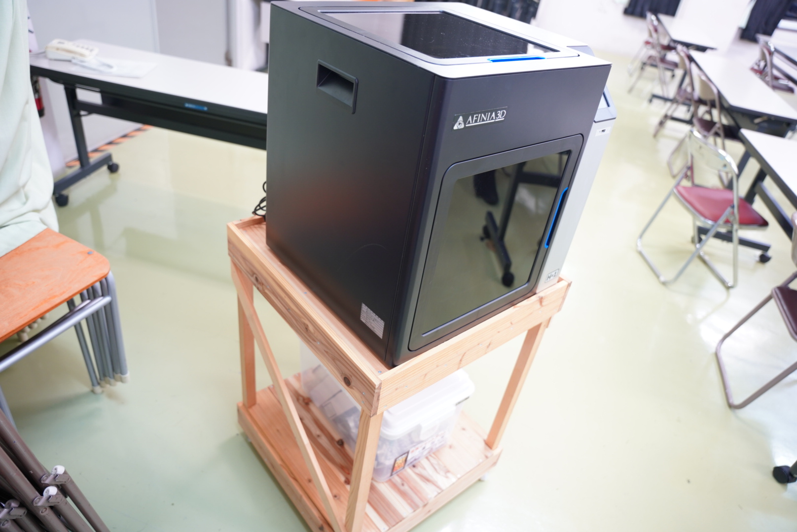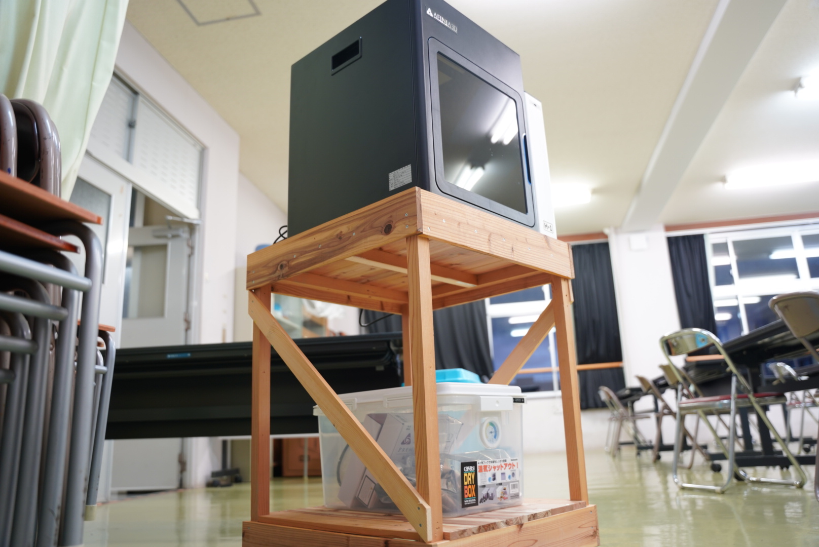 令和7年10月23日、ついにプリンタの台が完成しました。キドさん渾身の台は、強度はもちろんのこと、豪華キャスターつき!縦長の多目的室なんですが、縦横無尽に3Dプリンタがコロコロ移動しているのは本当に便利。