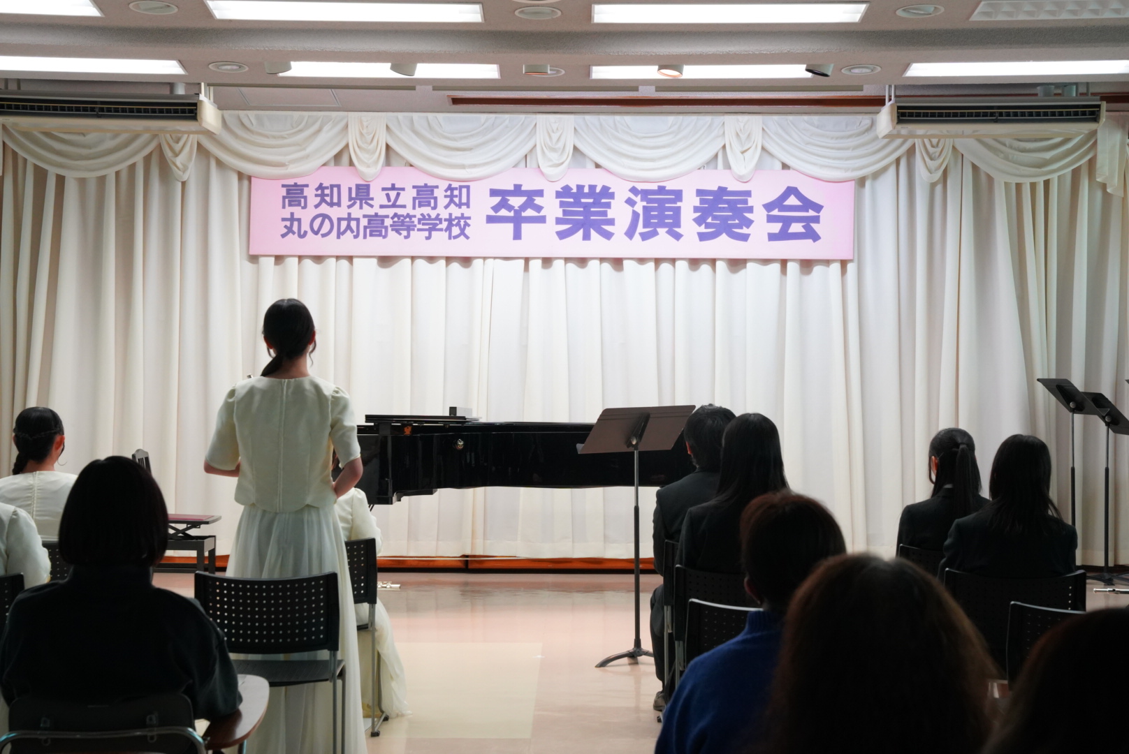 会場準備からアナウンス、受付、転換スタッフから観客まですべて生徒が行います。保護者等のみなさん、先生方、後輩が見守る中、ひとりひとりがていねいに演奏を終えていきます。