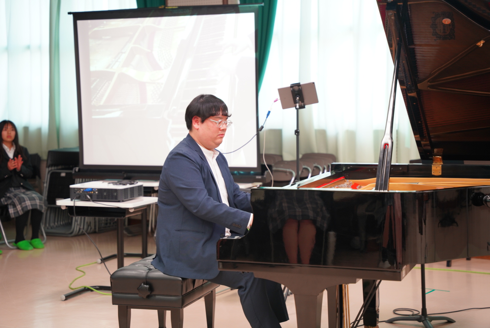 令和8年1月15日、新年のすがすがしい空気の中ひとりのピアニストが来校しました。「高瀬啓伍」というピアニストで、関東を中心に全国で活躍しています。